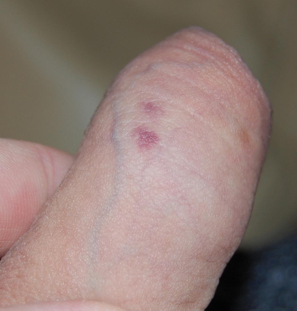 Доктор, здравствуйте. Сегодня на коже полового члена обнаружил 2 красных округлых пятнышка. Боли при моче испускании, да и боли вообще нет. Около месяца назад был петтинг без соприкосновения половых органов, половая жизнь не очень активная, а если и активная то с кондомом.