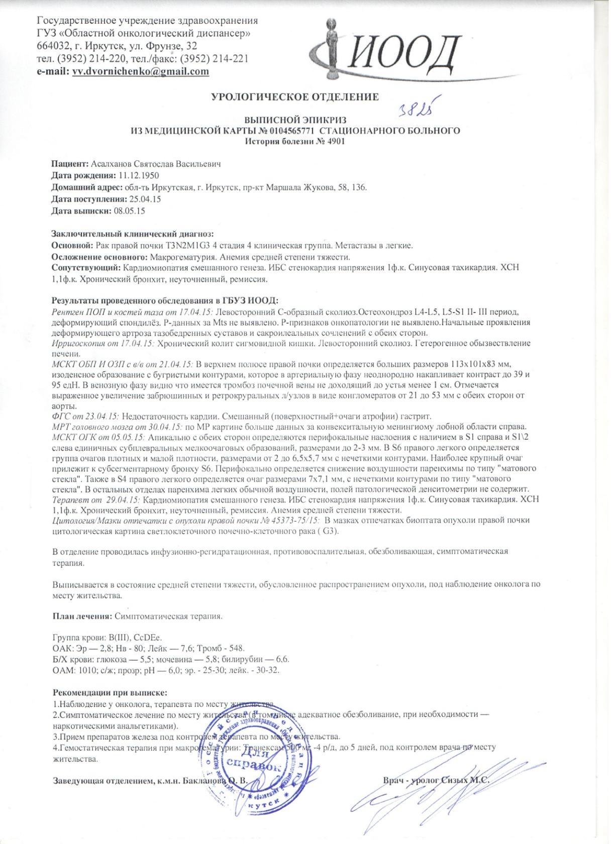Ситуация, конечно, непростая.Если пациент транспортабельный, попробуйте съездить в Онкологический центр им. Блохина в Москве(на Каширке).