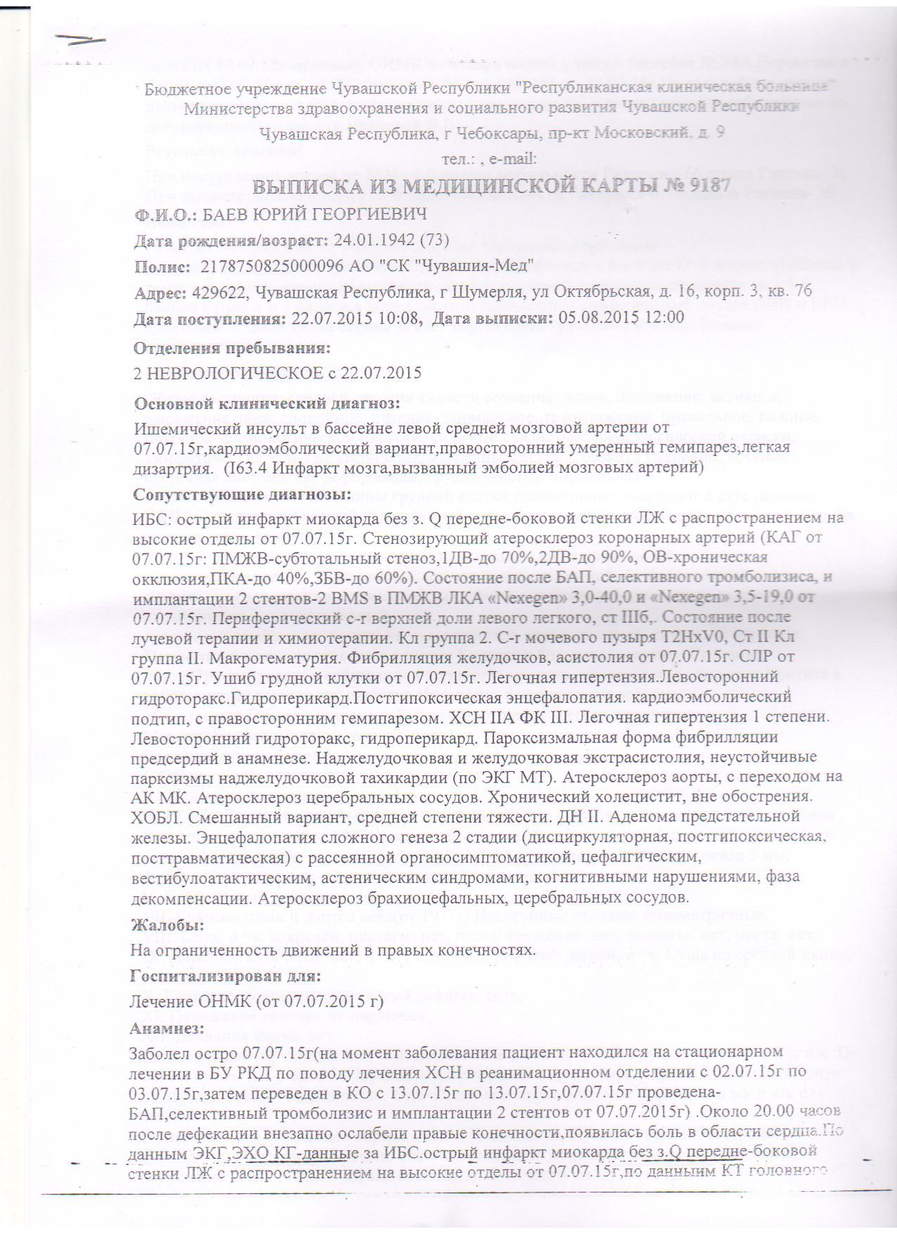 НАЗНАЧИЛИ ОПЕРАЦИЮ, НО У НЕГО СЛУЧИЛСЯ ИШЕМИЧЕСКИЙ ИНСУЛЬТ В БАССЕЙНЕ ЛЕВОЙ СРЕДНЕЙ МОЗГОВОЙ АРТЕРИИ ОТ 07.07.15., КАРДИОЭМБОЛИЧЕСКИЙ ВАРИАНТ,ПРАВОСТОРОННИЙ УМЕРЕННЫЙ ГЕМИПАРЕЗ,ЛЁГКАЯ ДИЗАРТРИЯ(163.4 ИНФАРКТ МОЗГА,ВЫЗВАННЫЙ ЭМБОЛИЕЙ МОЗГОВЫХ АРТЕРИЙ).