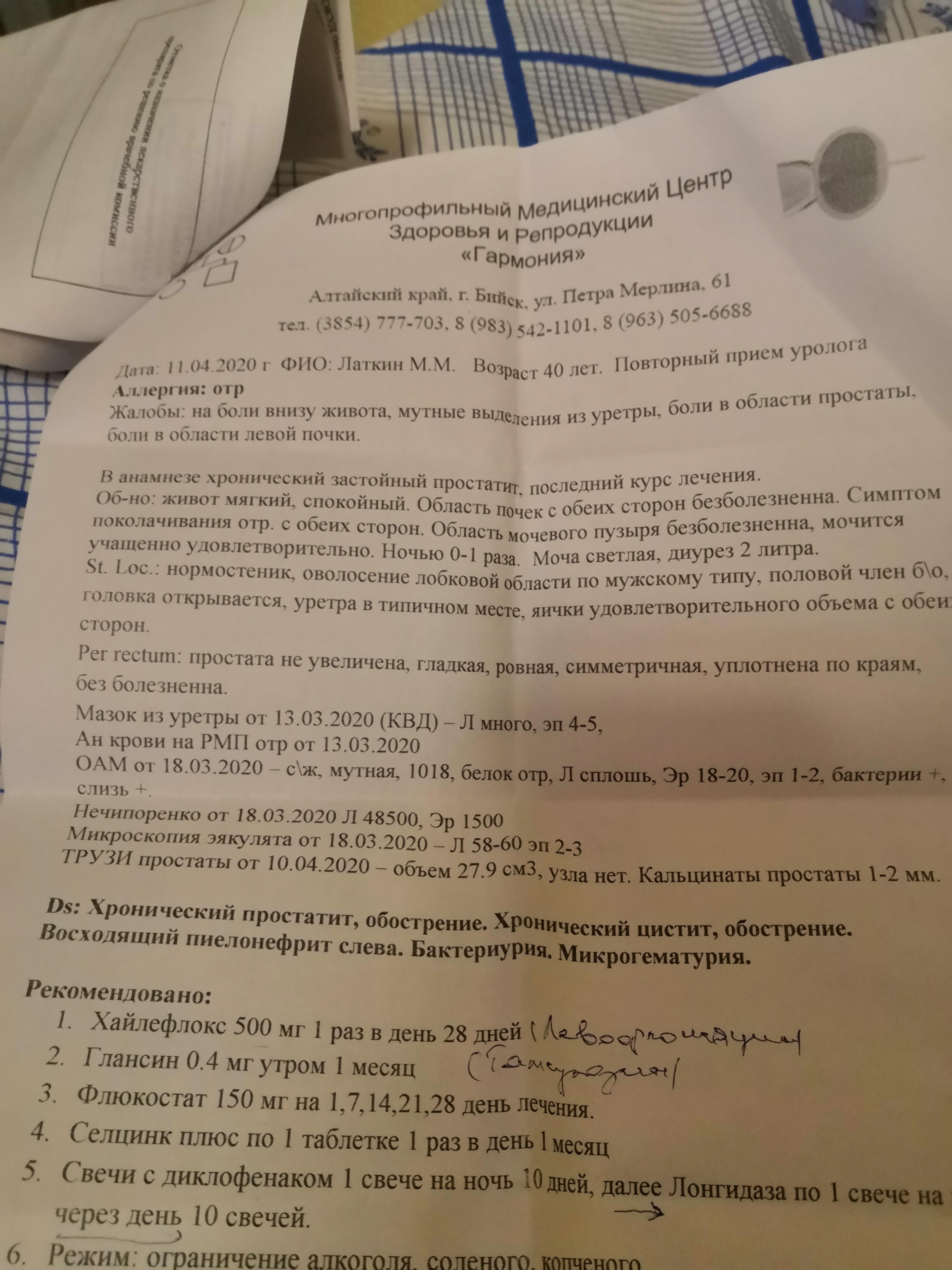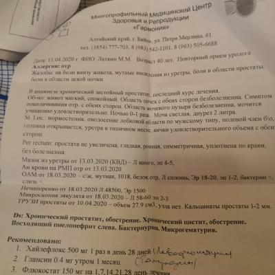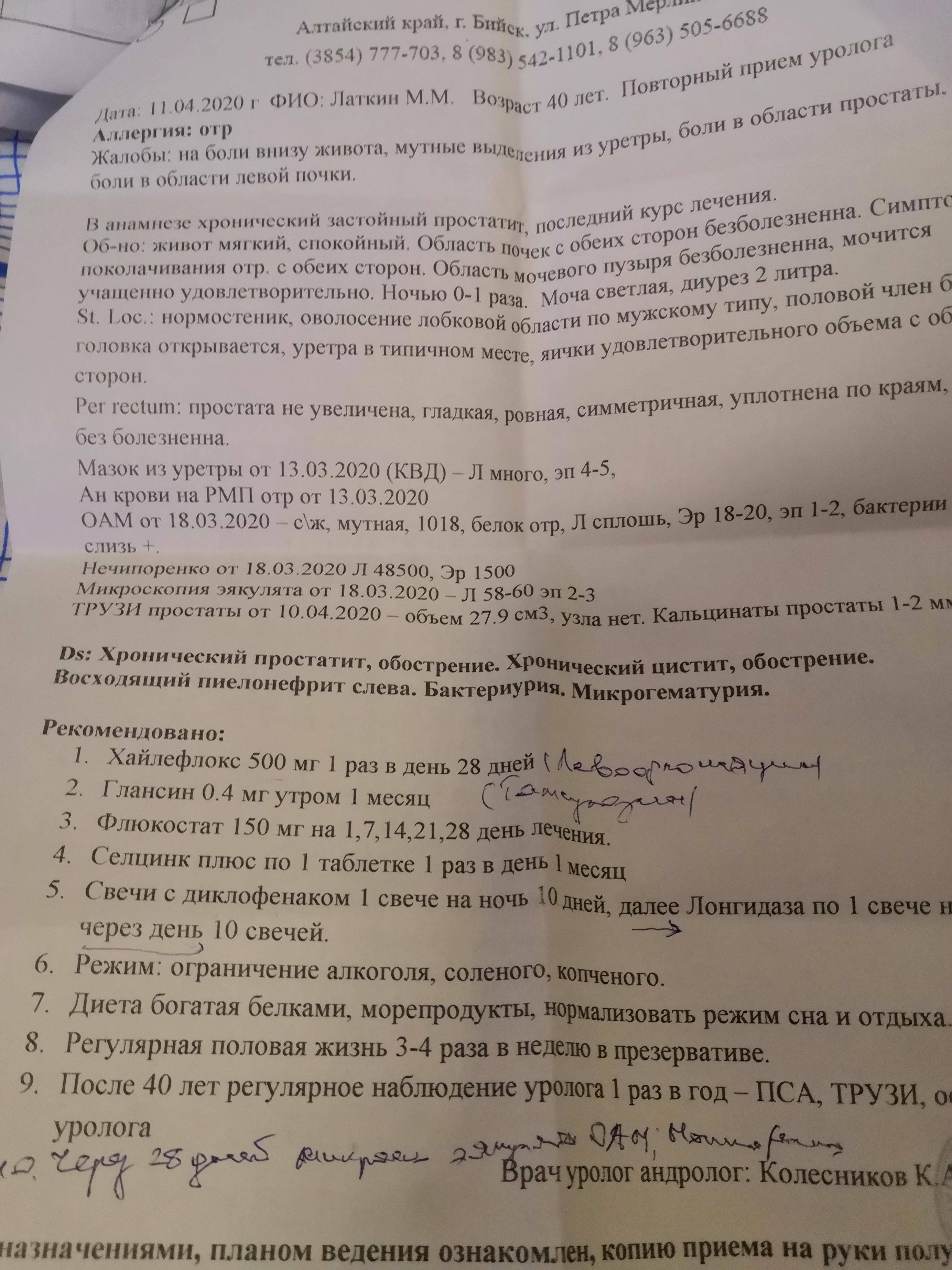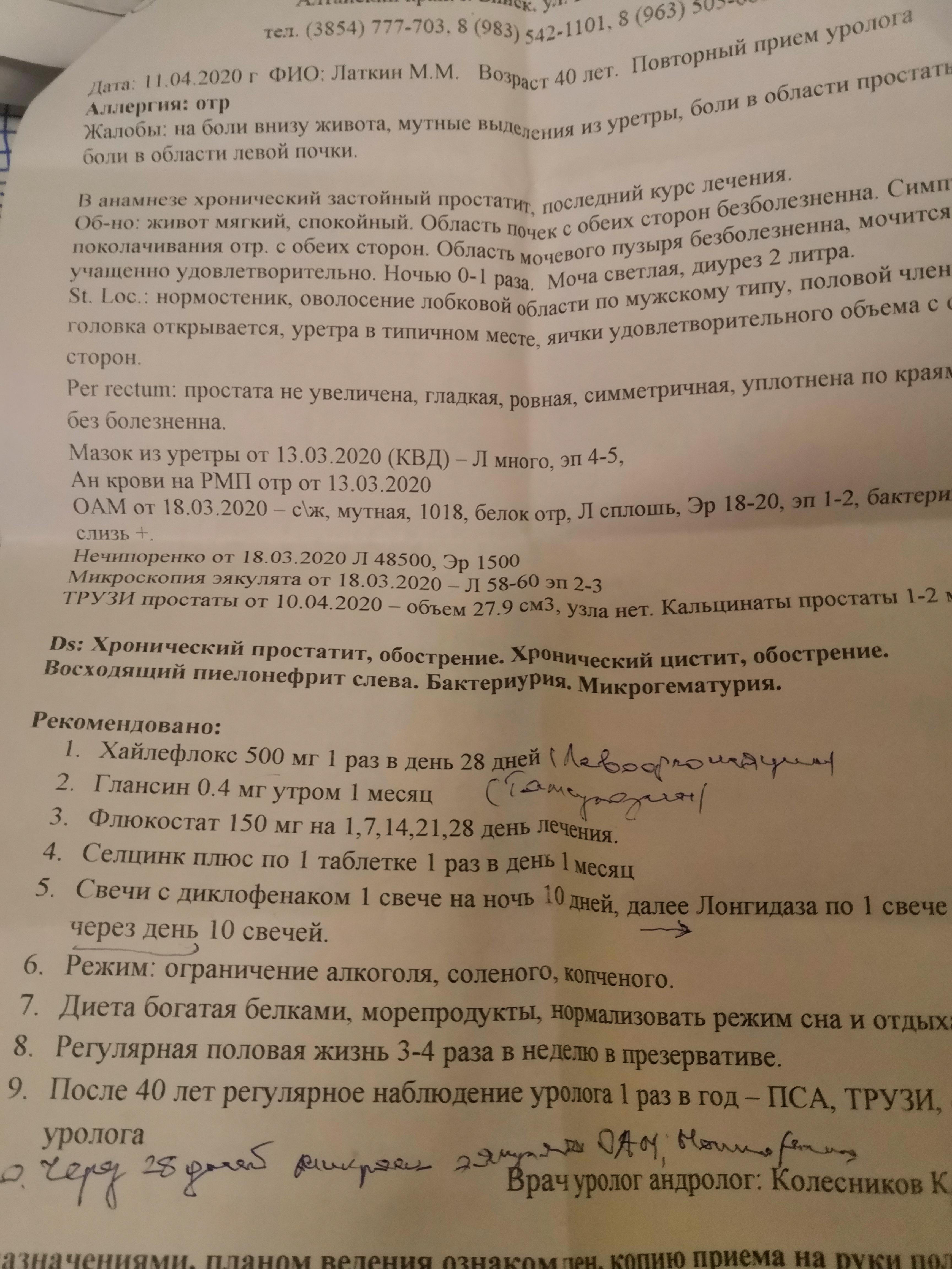 Здравствуйте помогите, осенью ставили застойный прастотита, были лекацыты в соке простаты 18-20,личился месец антибиотики, и свечи, контрольный анализ после норма, в марте начелось жение в уретри, сдал анализы мочи, общий, нечепоренко, сперму, привышен и лейкоциты, в сперме 60,в моче сплош, нечепоренко 48000,назначили опять месец антибиотики, сказали что переохладился, но не где не мерз, может причи на в другом, анализы и заключении и лисение скину, фото, помогите советом, а то уже года 3 переодически антибиотики пью