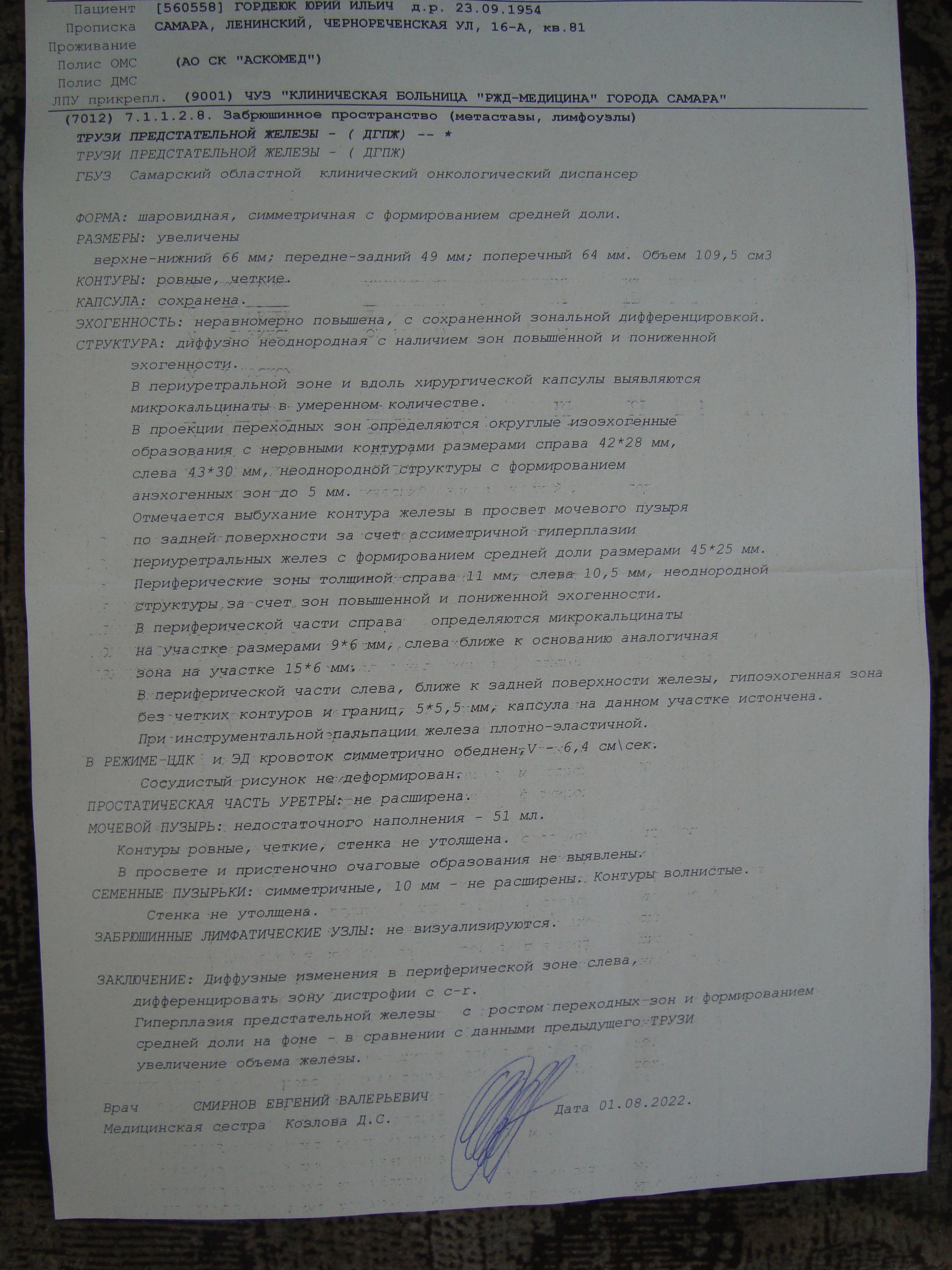 Добрый день! У Вас имеет место аденома предстательной железы, которая по сравнению с предыдущим УЗИ показывает рост, который нарушает мочеиспускание. Также обнаружен участок в предстательной железе, который подозрителен на новообразование. Вам нужно серьезно дообследоваться - сдать анализ крови на ПСА, выполнить МРТ малого таза. Возможно, что пойдет речь о биопсии предстательной железы. В Самаре можете обратиться к Губанову Евгению Сергеевичу - САМАРА, ул Ставропольская, 216 тел 8(846)3311888, +79033043008. С уважением.