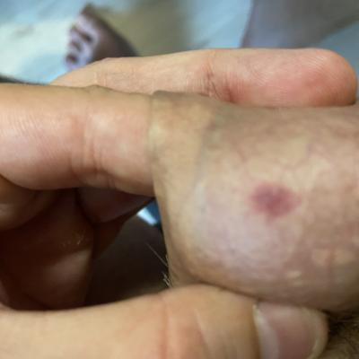 - На фотографиях видно единичное, округлое, плоское, темно-красное пятно на стволе полового члена размером в диаметре до 4-5 мм, без признаков воспаления, гнойного содержимого или других изменений кожного покрова.